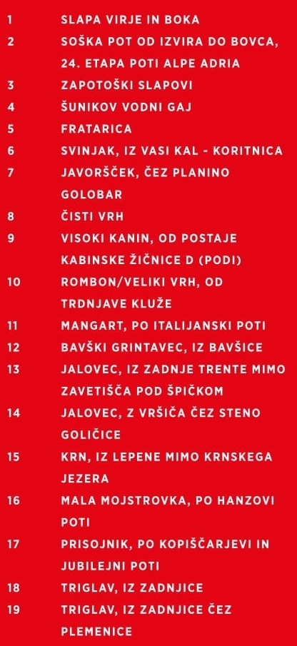 | Zbrani izleti in ture za vsakogar; dolinski sprehodi, nezahtevni vzponi na sredogorske vrhove, zahtevne in zelo zahtevne poti na dvotisočake. |