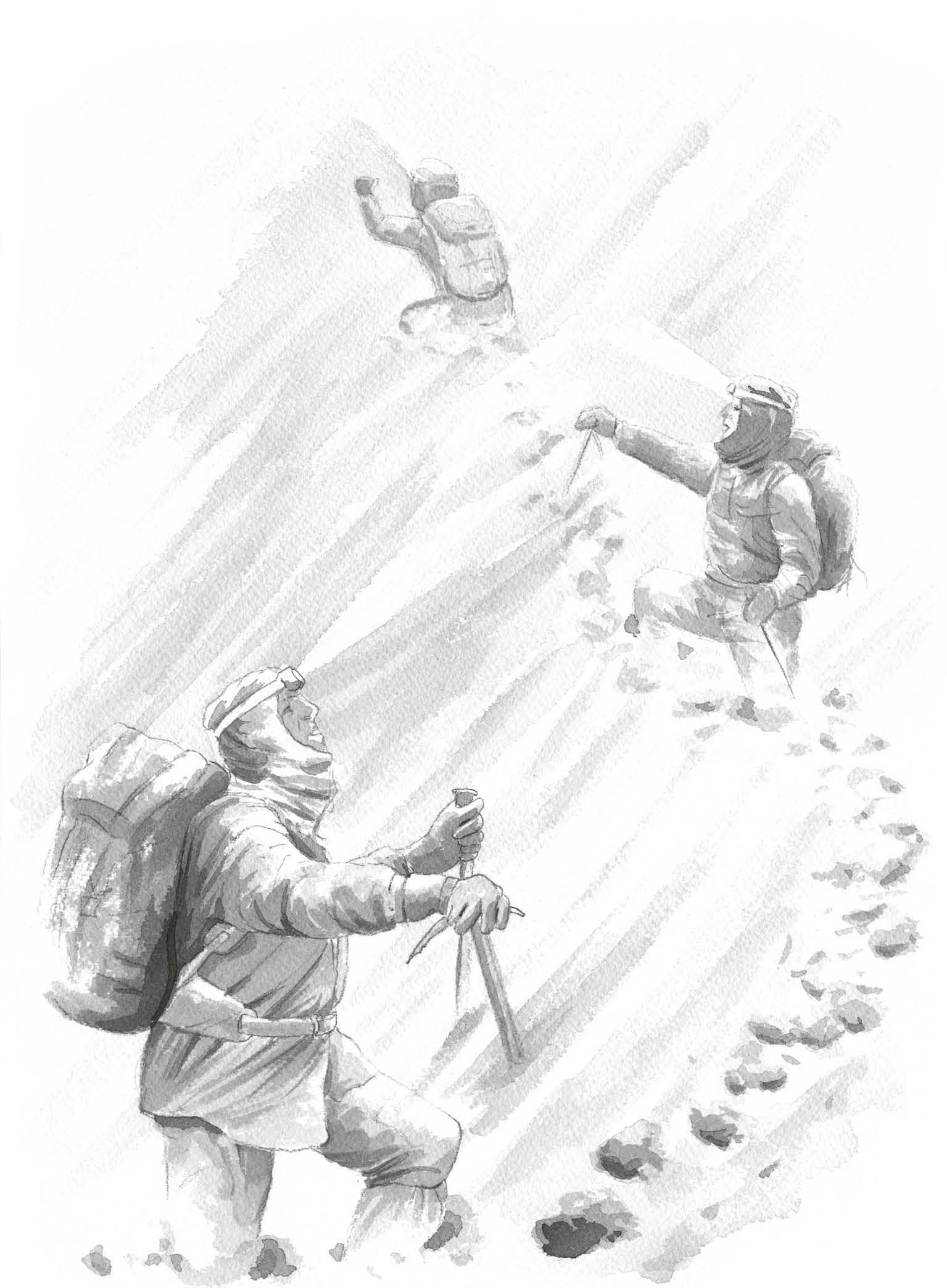 Brez besed se zaženemo navzgor. Vsak trenutek pričakujemo nov plaz. Luč osvetljuje samo kratek del, kamor stopam, tu in tam dvignem glavo in pogledam naprej. Kaj je tam zgoraj? Vsak gazi sam za sebe. Če bi bili navezani, bi lahko potegnilo vse dol, zdaj pa lahko potegne le koga od nas ... Samo bezljam v temno noč, ki jo prekinjajo sunki vetra in ples snežink. Nimam občutka, koliko časa hodimo gor, samo sledim enemu pred sabo in sopiham.