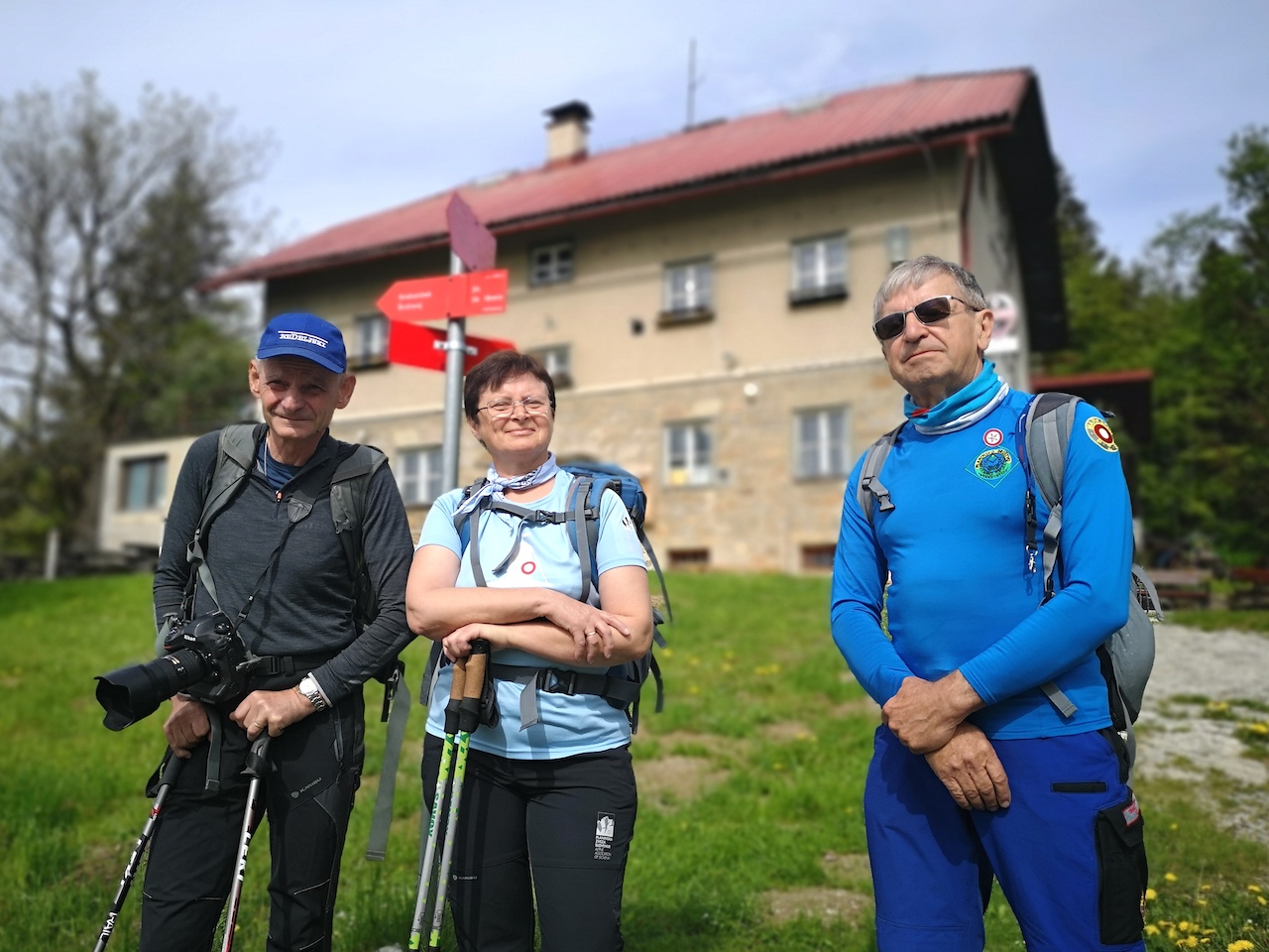Franci Horvat, Manja Rajh in Ivan Šalamon pri Andrejevem domu na Slemenu, kajti prav na Slemenu nad Šoštanjem so planinska društva celjske regije novembra 1958 osnovala Vezno planinsko pot XIV. divizije (foto Manca Ogrin)