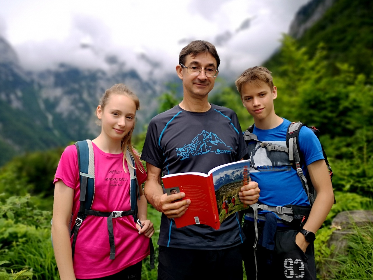 Avtor priročnika Osnove planinstva Jože Drab s svojima učencema Klaro in Janom, ki obiskujeta gorniški krožek na OŠ Sostro (foto Manca Ogrin)