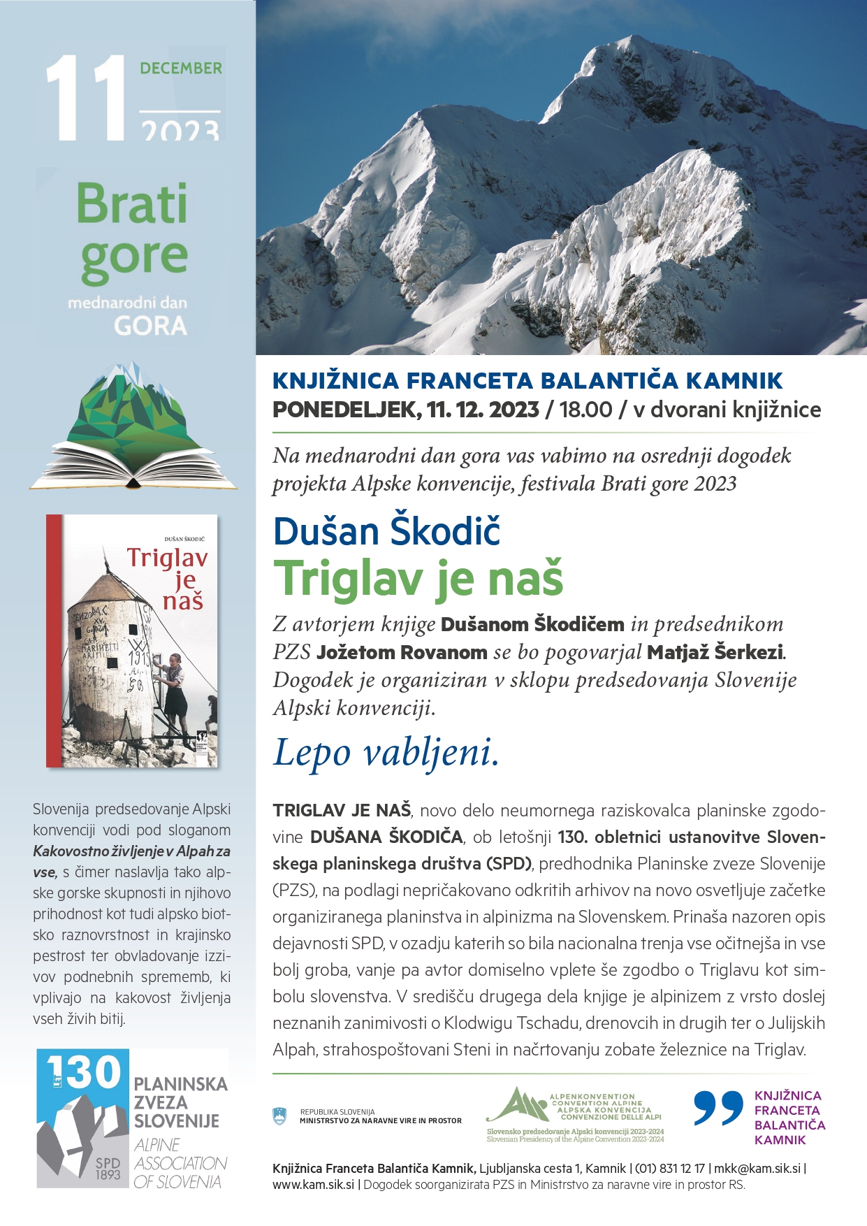 Knjiga Triglav je naš bo ob 130. obletnici Planinske zveze Slovenije v središču pozornosti na osrednjem dogodku festivala Alpske konvencije Brati gore 2023 v Knjižnici Franceta Balantiča Kamnik.