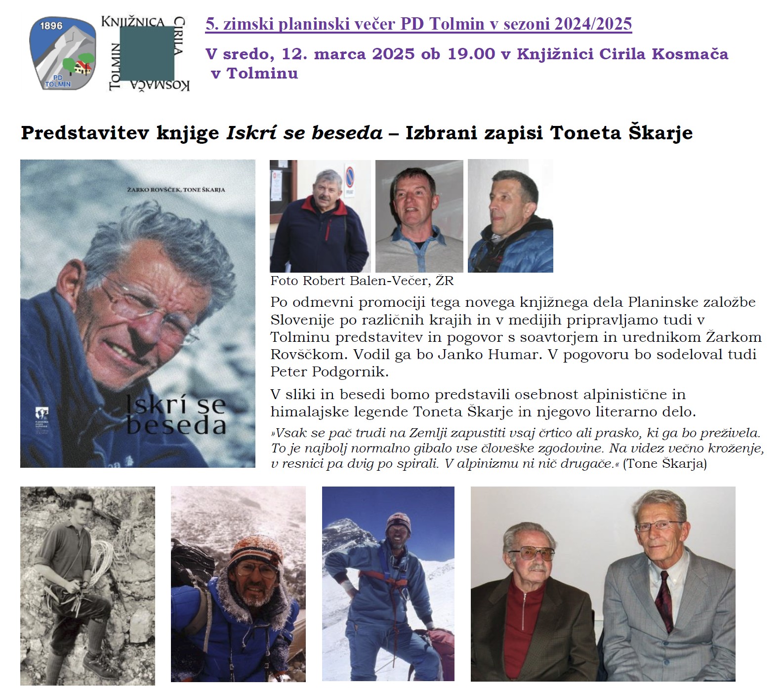 Vabljeni na 5. zimski planinski večer PD Tolmin v sezoni 2024/2025. V sredo, 12. marca 2025 ob 19.00 bo v Knjižnici Cirila Kosmača v Tolminu predstavitev knjige Iskrí se beseda - Izbrani zapisi Toneta Škarje.