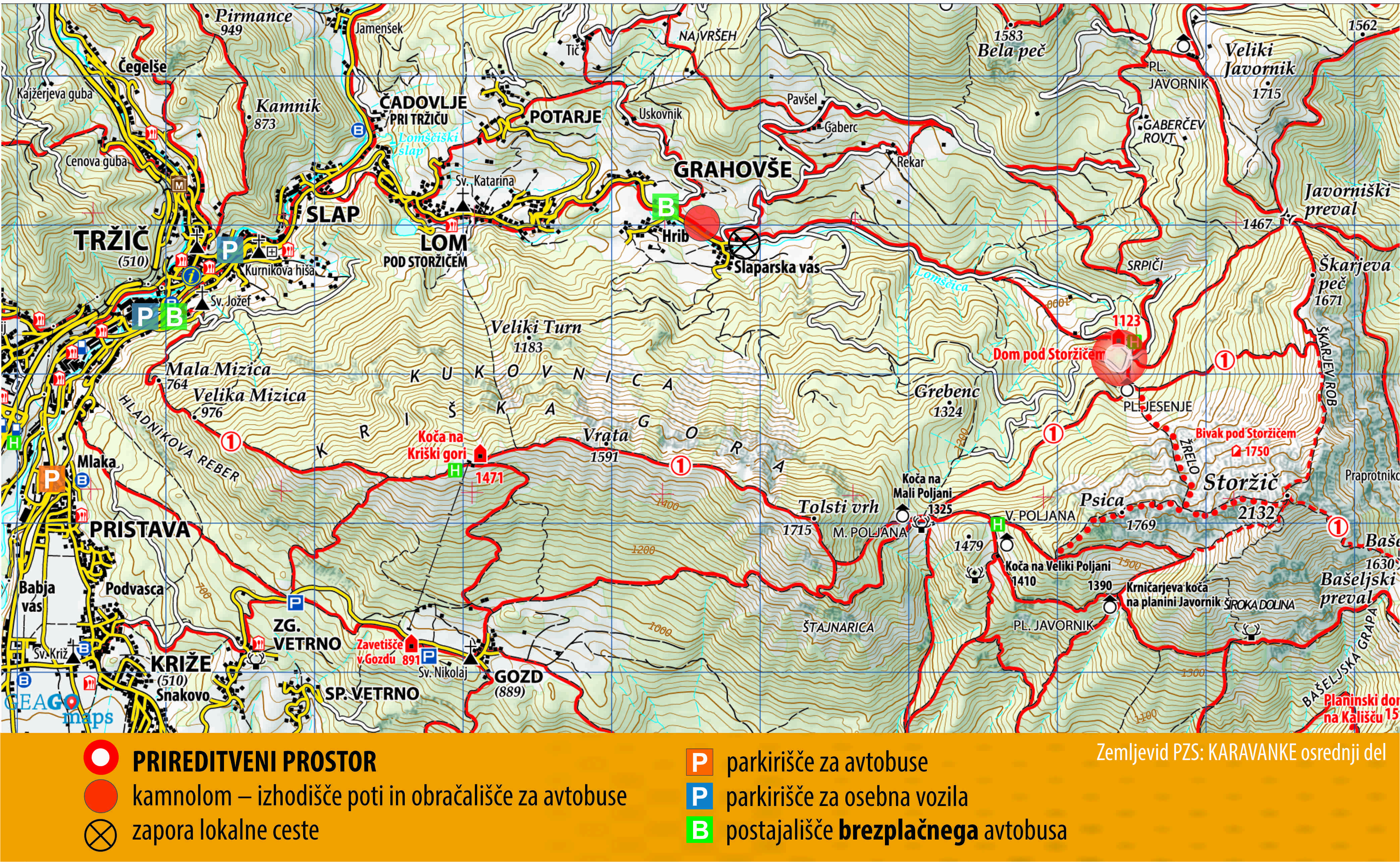 SKUPINAM priporočamo, da se s svojim avtobusom zapeljejo do kamnoloma v Grahovšah, izhodišča za izlete, nato pa se njihov avtobus vrne v Tržič – parkirišče za avtobuse bo na Alpetourjevem parkirišču (Mlaka 4; 2 kilometra od glavne avtobusne postaje). OSREDNJI PARKIRIŠČI za avtomobile bosta pri tovarni BPT (Bombažna predilnica in tkalnica, Predilniška 14) in pri Dvorani tržiških olimpijcev (Šolska ulica 7), ki sta dobrih 200 metrov oddaljeni od glavne avtobusne postaje Tržič, od koder bo za POSAMEZNIKE, ki bodo v Tržič prispeli z avtomobilom, organiziran BREZPLAČEN AVTOBUSNI PREVOZ do Grahovš z odhodom ob 7.40 in 8.40.