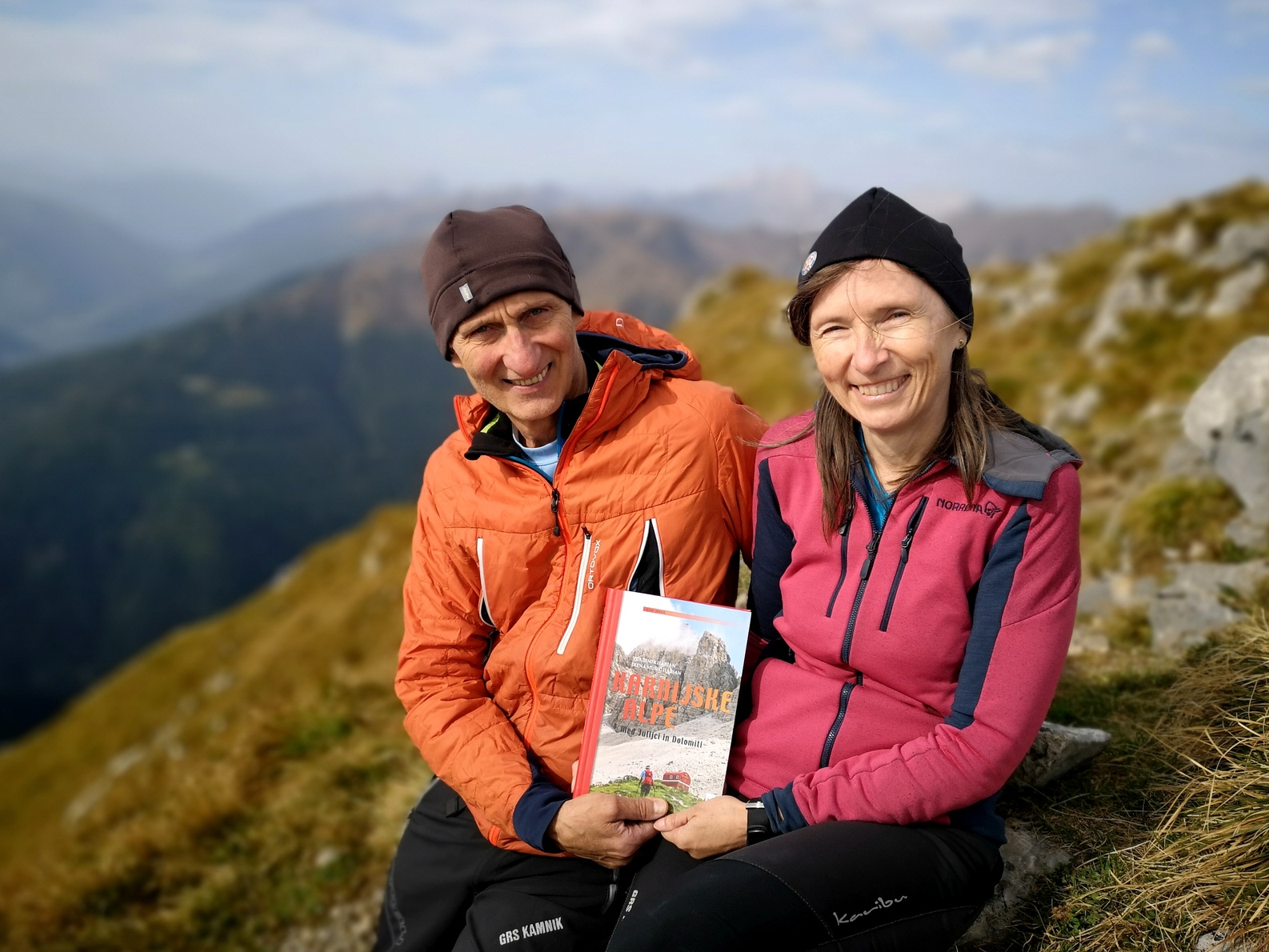 Vladimir Habjan in Irena Mušič Habjan s svojim novim vodnikom po Karnijskih Alpah (foto Manca Ogrin)