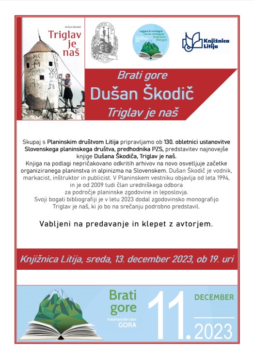 Planinsko društvo Litija in Knjižnica Litija pripravljata ob 130. obletnici ustanovitve Slovenskega planinskega društva, predhodnika PZS, predstavitev najnovejše knjige Dušana Škodiča Triglav je naš. V sredo, 13. decembra, ob 19. uri vabljeni na predavanje in klepet z avtorjem.